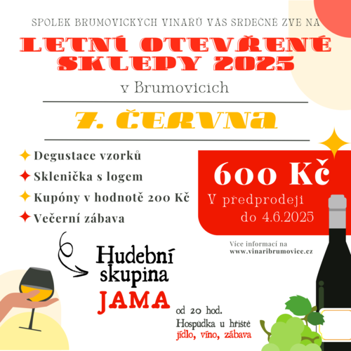 Brumovští vinaři srdečně zvou všechny milovníky vína na další ročník oblíbené akce Letní otevřené sklepy Brumovice, která se letos uskuteční o víkendu 7. a 8. června 2025.